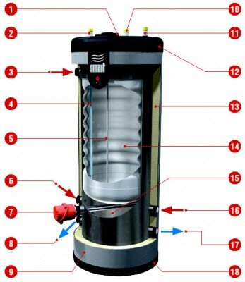2. Вход холодной санитарной воды 3. Присоединение подающей линии системы отопления 4. Деспенсер (рассекатель струи холодной воды) 5. Гильза из нержавеющей стали для датчика термостата 6. Вход греющей жидкости (только SLE 210 - 240 - 300) 7. Электрический нагревательный элемент (опция) 8. Выход греющей жидкости 9. Полипропиленовый кожух 10. Патрубок рециркуляции ГВС 11. Выход горячей воды (контур ГВС) 12. Верхняя крышка из полипропилена 13. Изоляция из вспененного полиуретана 14. Бак из нержавеющей стали (контур ГВС) 15. Стальной внешний бак (первичный контур) 16. Вход системы отопления (только SLE 210 - 240 - 300) 17. Выход системы отопления (только SLE 210 - 240 - 300) 18. Нижняя крышка из полипропилена